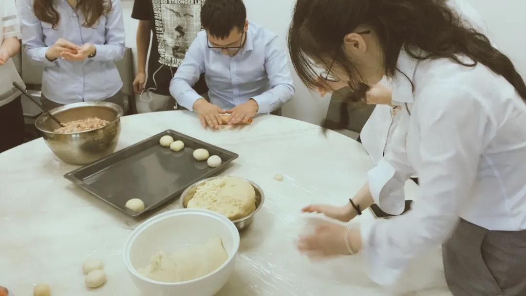利用中午休息時(shí)間,公司總部所有員工在員工餐廳進(jìn)行了“做月餅,迎中秋”的活動(dòng)。大家分工明確,合力協(xié)作,一起圍著餐桌,在財(cái)務(wù)部孫劼老師和食堂陳阿姨的指導(dǎo)下,認(rèn)真地學(xué)習(xí)著操作過程。先把外皮原料抓取一小團(tuán)放手上,用搟面杖壓成餅狀,然后把肉餡放入其中,捏好月餅形狀,這就做成了上海本地的非常受歡迎的鮮肉月餅雛形。