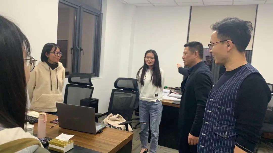 在實(shí)習(xí)生代表粟夢同學(xué)熟悉的指引下,皮建輝博士、柳井老師先后參觀了我司資料部、設(shè)計(jì)部、合約部,親切的看望了在各部門培訓(xùn)實(shí)習(xí)的同學(xué)們;