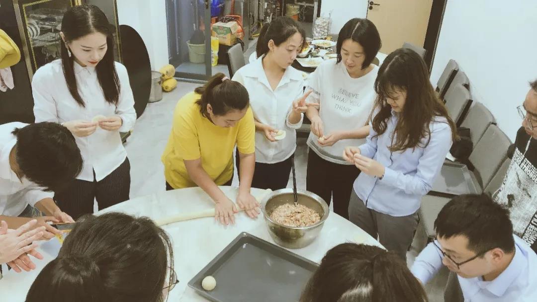 利用中午休息時(shí)間,公司總部所有員工在員工餐廳進(jìn)行了“做月餅,迎中秋”的活動(dòng)。大家分工明確,合力協(xié)作,一起圍著餐桌,在財(cái)務(wù)部孫劼老師和食堂陳阿姨的指導(dǎo)下,認(rèn)真地學(xué)習(xí)著操作過程。先把外皮原料抓取一小團(tuán)放手上,用搟面杖壓成餅狀,然后把肉餡放入其中,捏好月餅形狀,這就做成了上海本地的非常受歡迎的鮮肉月餅雛形。